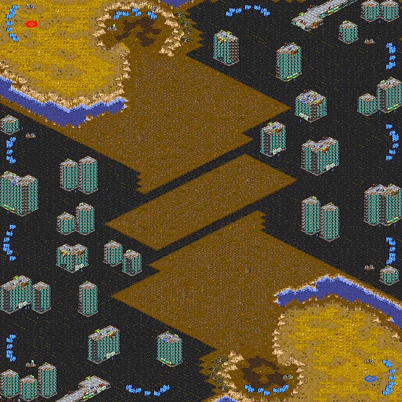 Don't let the relief of the buildings confuse you, they fulfill the same role as say lakes. Units can't cross behind them and large buildings can serve as ovie spots for zerg or places to hide shuttles (they have the fog of war in the center). The only difference is the roofs which are high ground but I have blocked them (although you can kill the terran civilians on top and then place units there). So essentially the map has a long unbuildable center which favors zerg and toss and a maze of corridors on the sides where the expos are which favors terran.