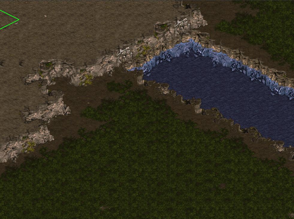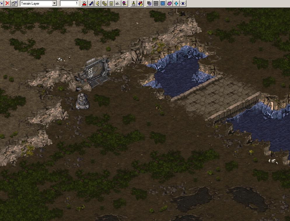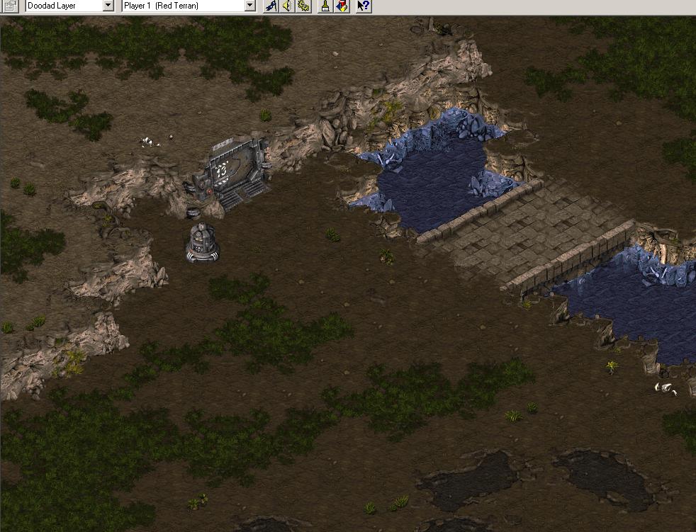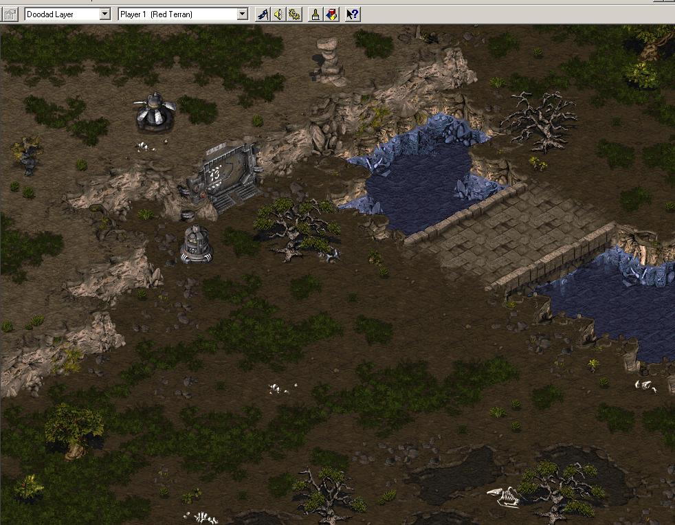 Observe that i have added no tilebased doodads, since i plan on finnishing the visuals of with StarForge too. Read the StarForge tutorial if you question why, this is just a way of working wich i have found effective and easy. Next step would now be to edit the terrain in StarForge, making it unique and beautiful. This is in -no way at all- required to make a beautiful map, most great maps havn't even been touched by starforge. But if You want to decorate a map like i did Space Pirates, You might find this as a good way of doing so. In StarForge i build terrain the same way i build wide bridges and ramps. i copy tiles and make my own decorations, simply like very small pieces of grass or dirt, to enhanche the texture even further: