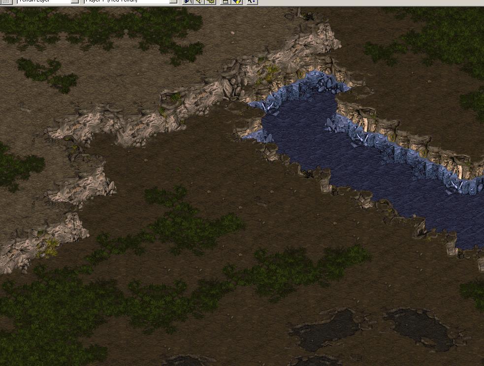 Now I go back into StarEdit to add the final touch, the trees and other tilebased doodads. Also The map will be fully StarEdit Compatible doing this way. If You have no training in using the triggersystem in StarForge, this method is what i recommend. Also, You need StarEdit to place minerals correctly. So here is the final picture with some trees and other stuff: