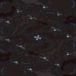 The mains have one exit towards the center and a backdoor blocked by a neutral overmind. The gas expos horizontally to the sides of the center are tankable from hills while the gas expos horizontally opposite from the mains are not. The large mineral only expos are tankable from the hill (but tanks there can be reached by ramps) although the small mineral only expos are not. Diagonal pathing as well as pathing to the areas of the map away from the overmind are OK but sending units to other areas may require its destruction or special instructions.